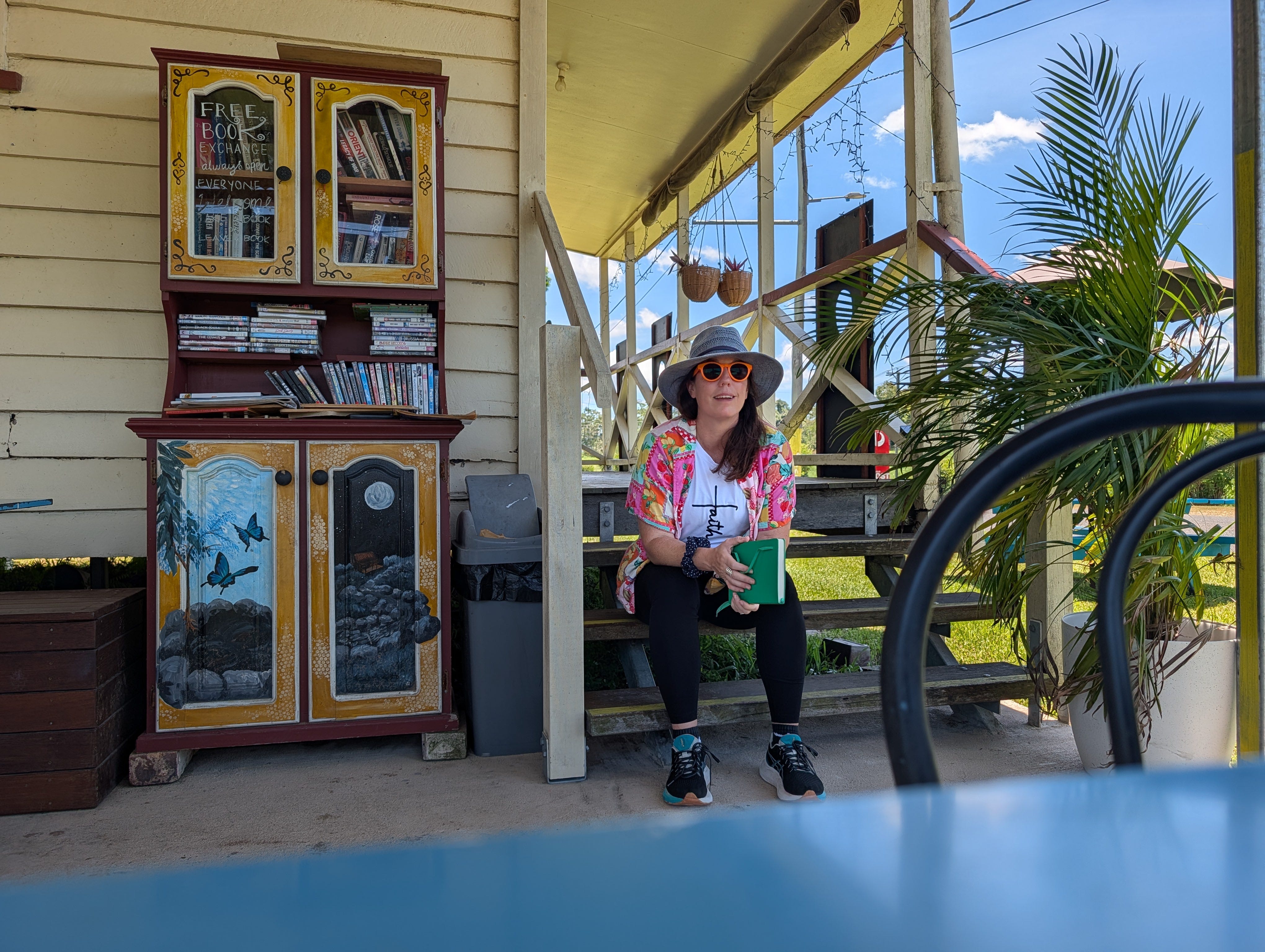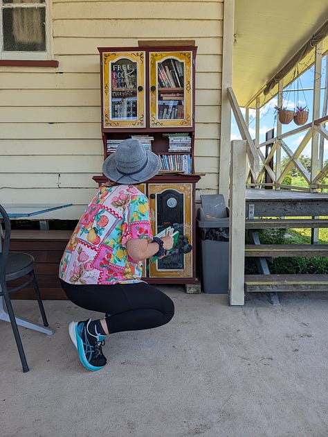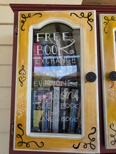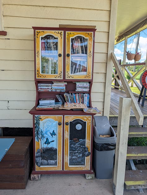 This is not a shop and not a library with desks or rules or someone watching from behind a counter, but a cupboard on a veranda holding books and trust in roughly equal volume and asking very little in return.